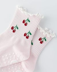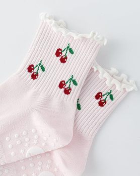 Bordado de alta calidad cereza personalizado Grippy Yoga Pilates Calcetines antideslizantes lindos calcetines de tripulación con agarre bajo MOQ precio bajo calcetín con volantes